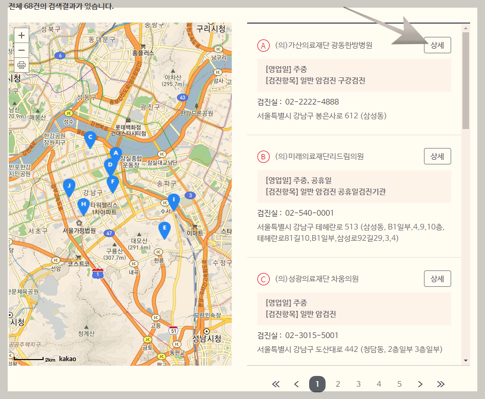 지도와 함께 지역의 검진 기관이 검색됩니다.